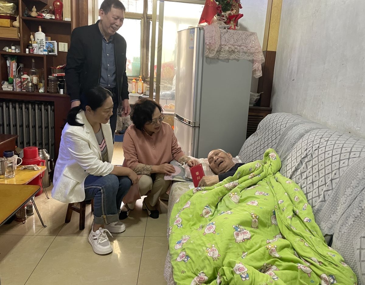 韩喜如老同志是新中国成立前参加革命工作的老战士,已有76年的党龄,曾参加过淮海战役、渡江战役、两广战役、解放郑州外围阻击战等战役。“老爷子,在新中国成立75周年之际,我代表集团党委来看望您,祝您健康长寿。”慰问组领导走进96岁高龄的老党员韩喜如家中,关切地询问他的身体和饮食起居状况,为他送上1000元的慰问金,与老人和家属亲切交谈,唠家常、聊近况,希望老同志保重身体,安享幸福晚年。