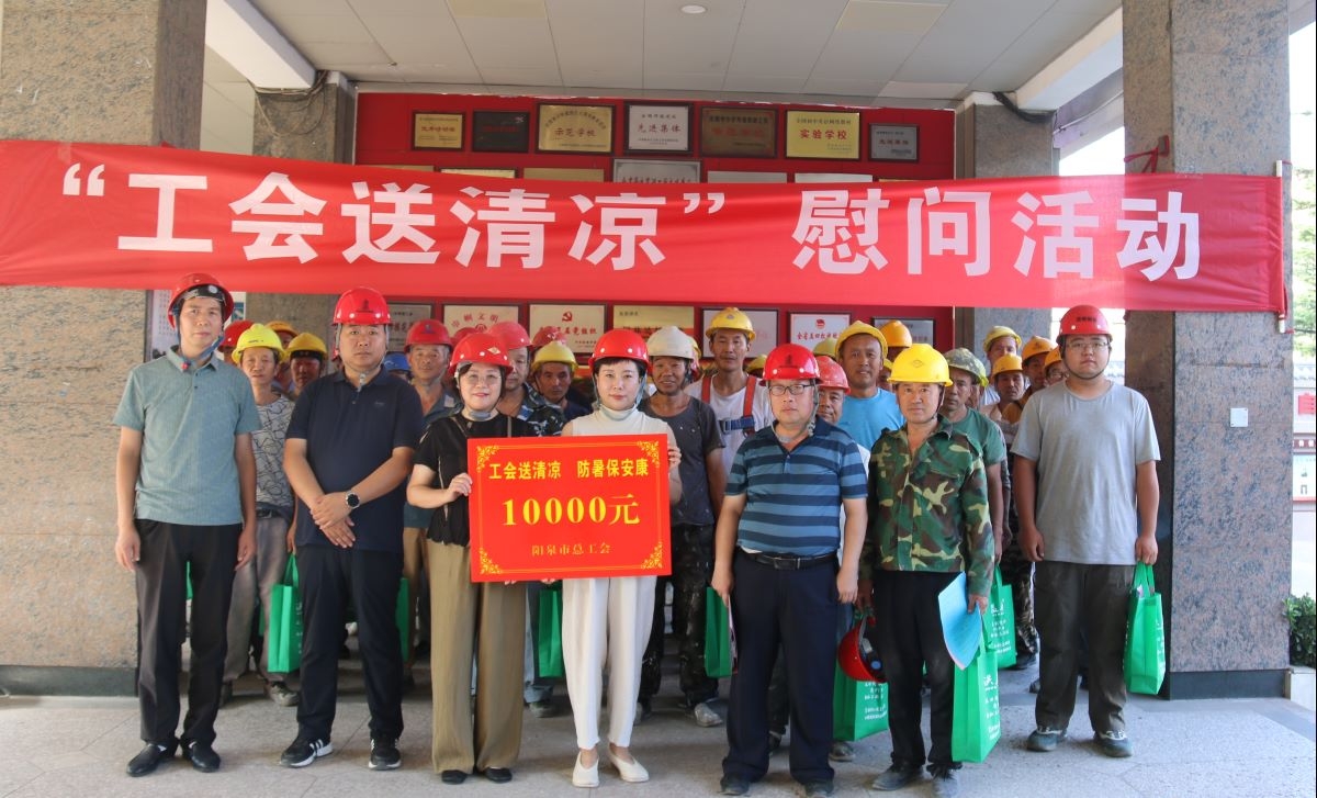 盛夏八月,烈日当空,为切实保障高温天气下职工的身心健康与安全生产,进一步做好夏季防暑降温工作。近日,市总工会党组成员、副主席宋凯宏,市总工会保障部部长郭雷锋,集团公司党委委员、工会主席丁志芳及工程二处领导班子成员深入阳泉市第二中学校危旧房屋重建工程项目开展“工会送清凉”慰问活动,向酷暑中坚守岗位的一线职工送去深切问候与防暑物资。